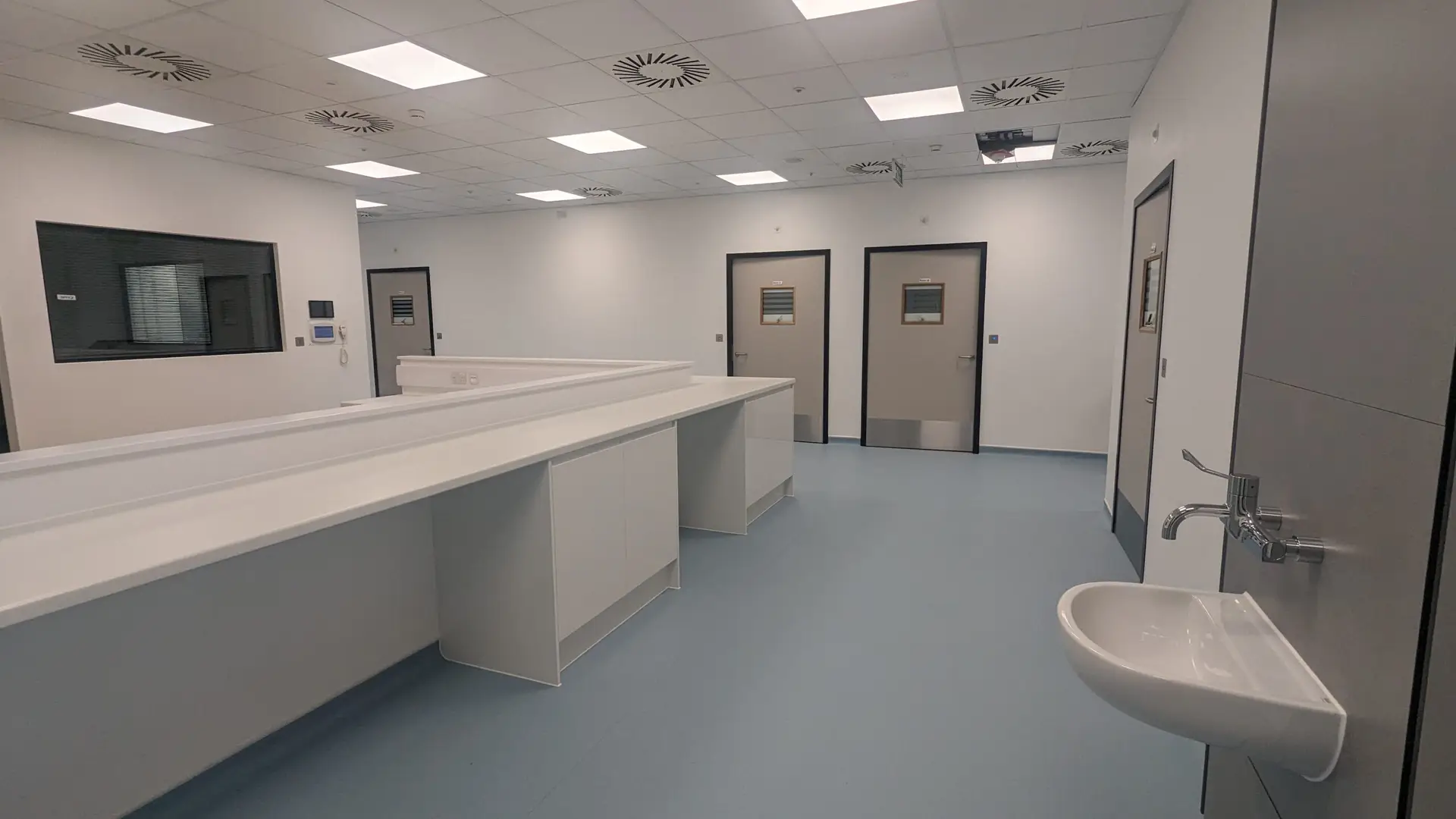 - Class 1 safety cabinets, autoclave, and waste sink in the CL3 lab.